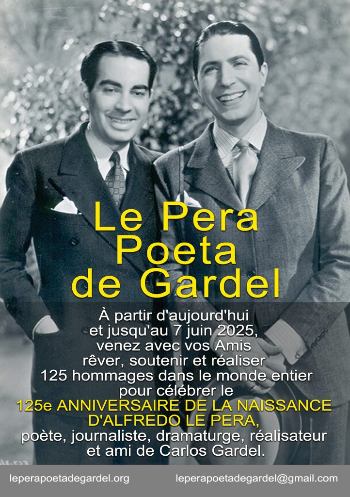 Desde hoy hasta el 31 de diciembre de 2025 vengan con sus Amigos a soñar, apoyar y realizar 125 Homenajes en todo el mundo para conmemorar merecidamente el 125º ANIVERSARIO DEL NATALICIO DE ALFREDO LE PERA, destacado poeta, periodista, traductor, autor teatral, cinematográfico y Amigo de Carlos Gardel.