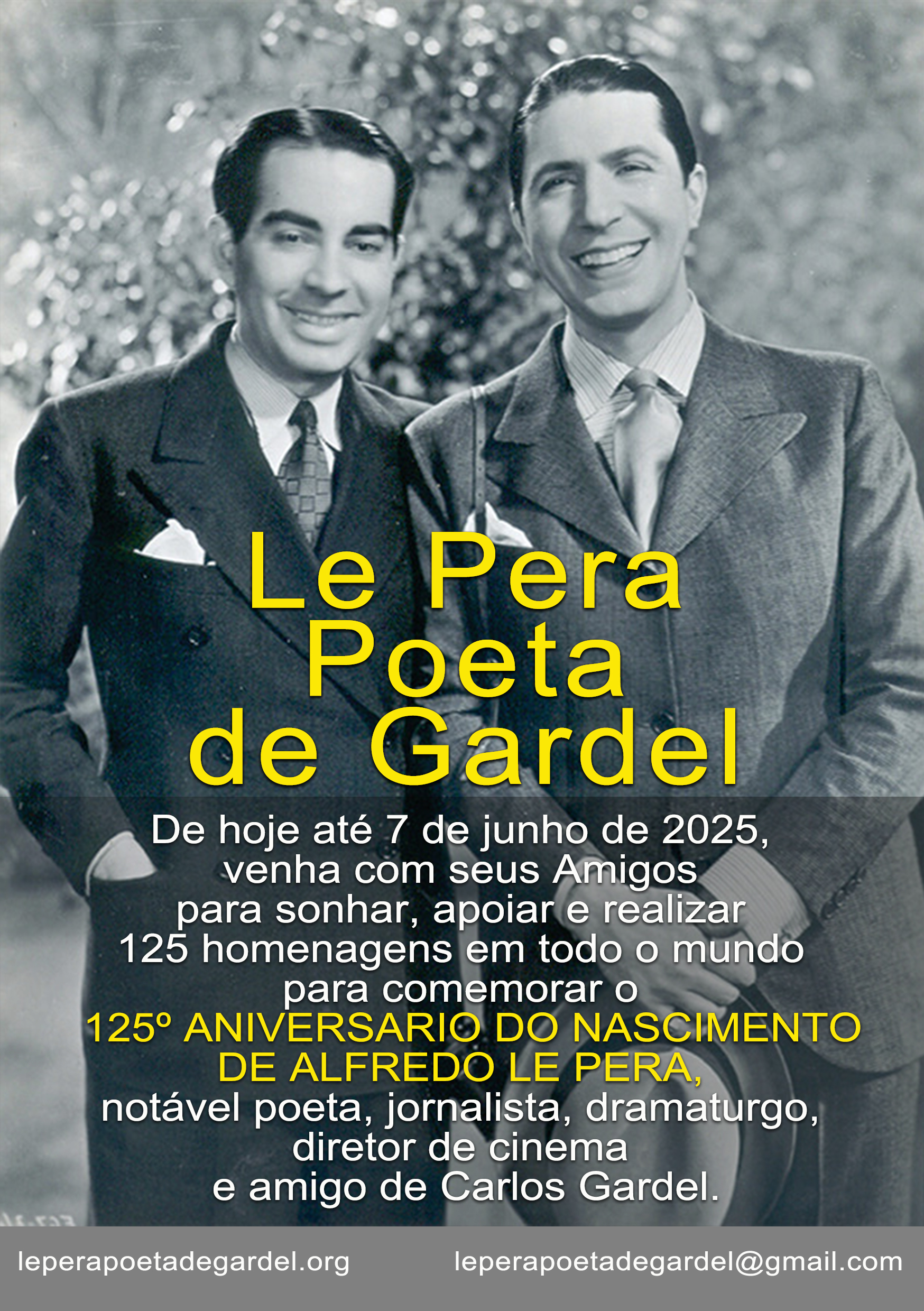 De hoje até 31 de dezembro de 2025, venha com seus Amigos para sonhar, apoiar e realizar 125 homenagens em todo o mundo para comemorar o 125º Aniversário do Nascimento de Alfredo Le Pera, notável poeta, jornalista, dramaturgo, diretor de cinema e amigo de Carlos Gardel.