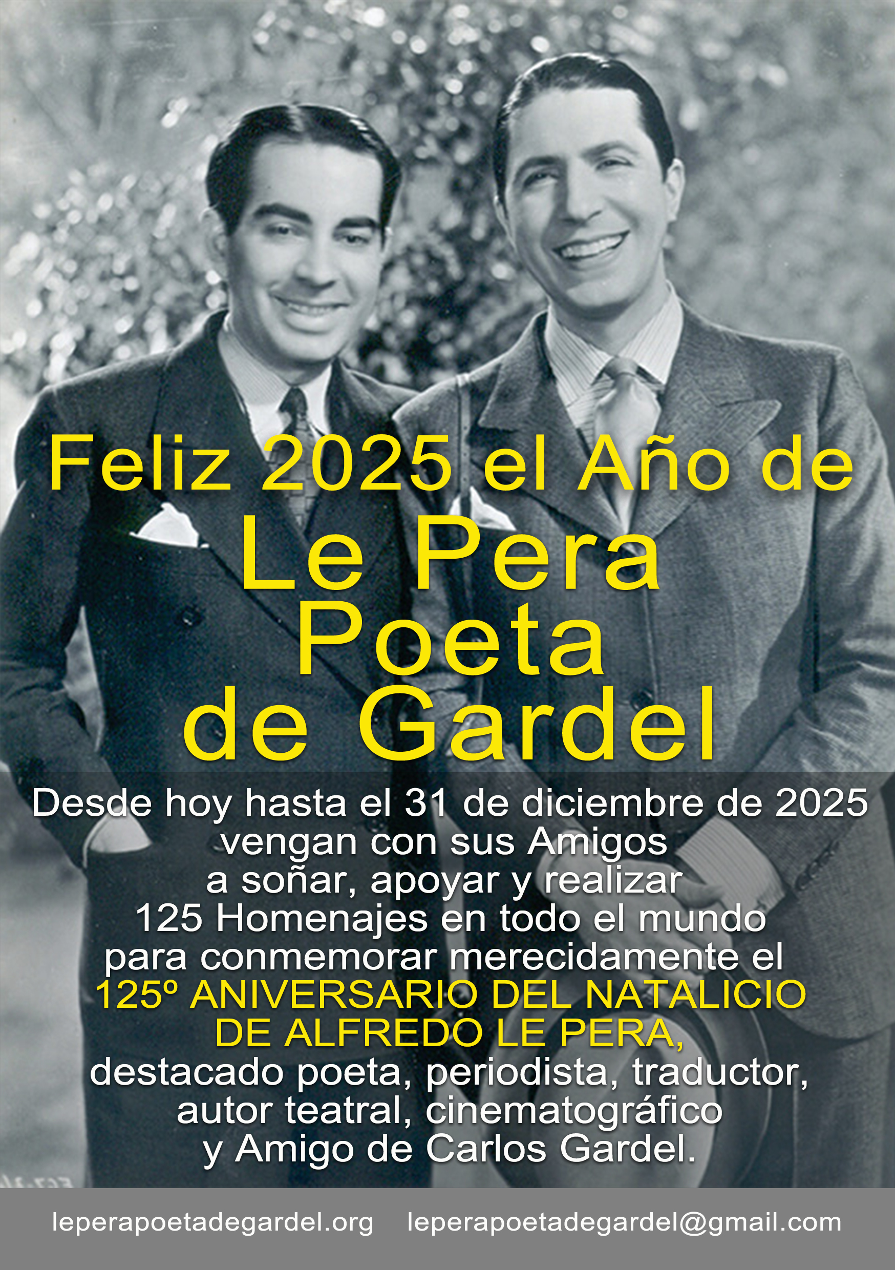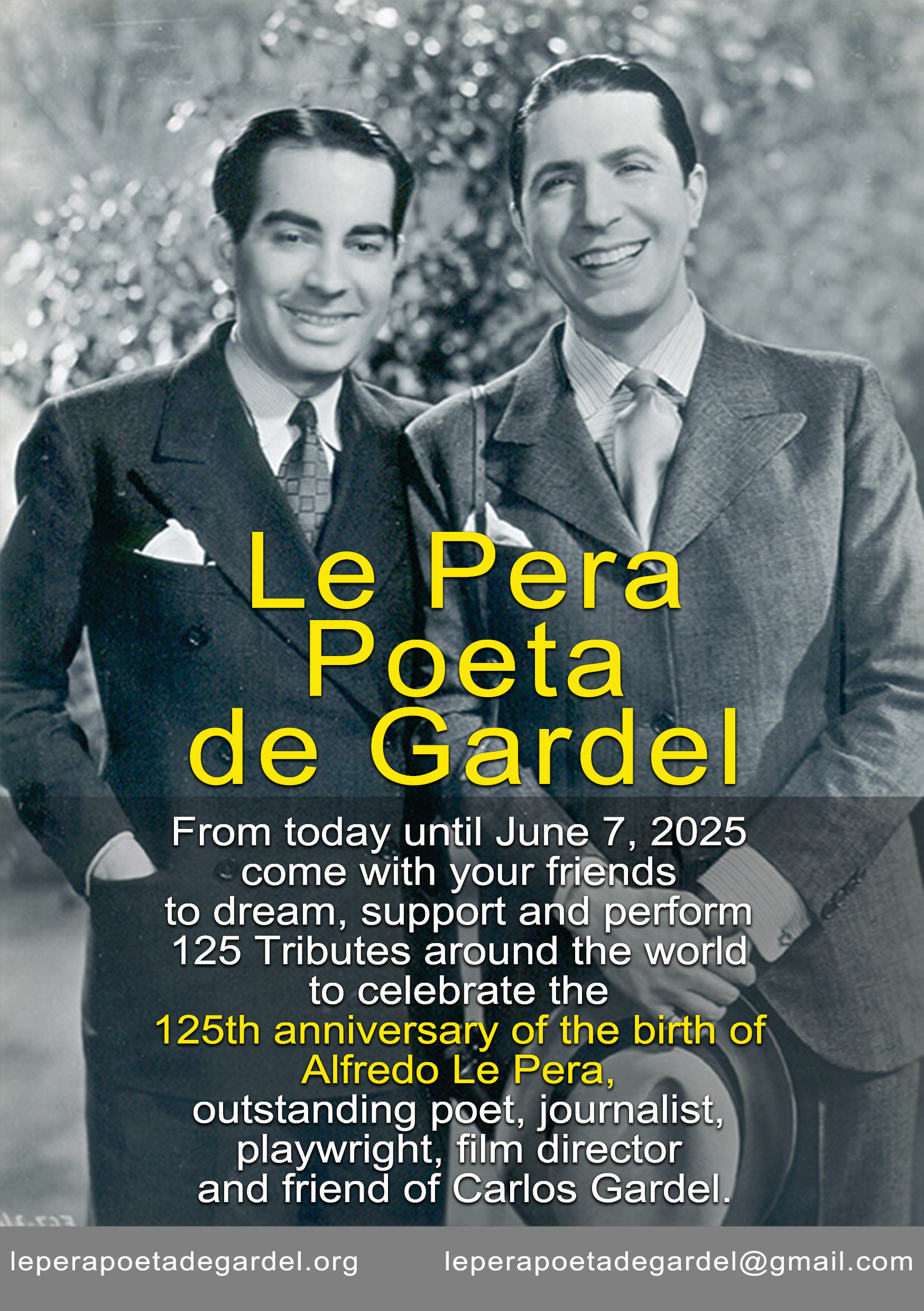 Desde hoy hasta el 31 de diciembre de 2025 vengan con sus Amigos a soñar, apoyar y realizar 125 Homenajes en todo el mundo para conmemorar merecidamente el 125º ANIVERSARIO DEL NATALICIO DE ALFREDO LE PERA, destacado poeta, periodista, traductor, autor teatral, cinematográfico y Amigo de Carlos Gardel.