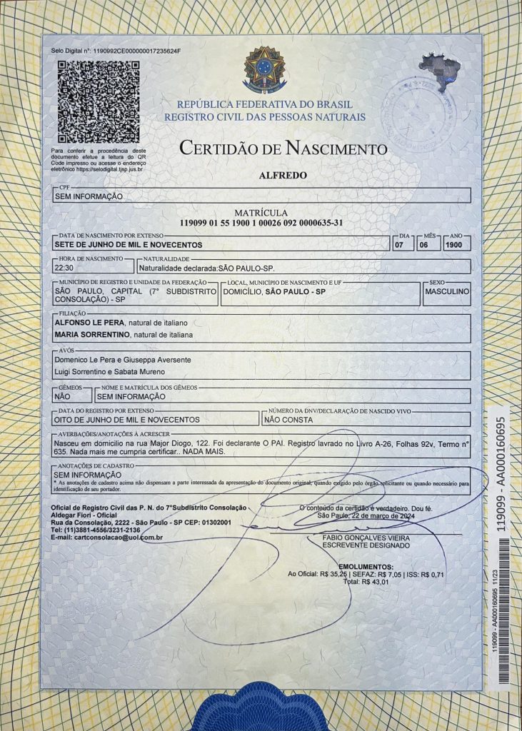 Gabriel Soria recibió el original del Certificado de Nacimiento de Alfredo Le Pera que le enviaron desde São Paulo Brasil los Queridos Amigos Peter Carcavallo, Denise Llamas y Armindo Zunder da Rocha. Todos los participantes recibieron una copia fotográfica hecha especialmente por Cris Posada.